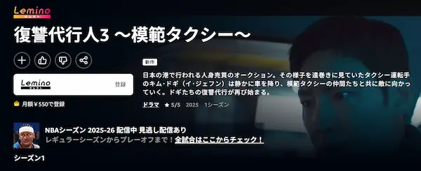 韓国ドラマ『復讐代行人3~模範タクシー』は、2025年11月21日(金)23時20分からLeminoプレミアムで観れます。
