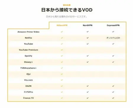 筆者がMillen VPNをおすすめする一番の理由はMillen VPN公式サイトがVOD対応表を作ってくれているという点です。